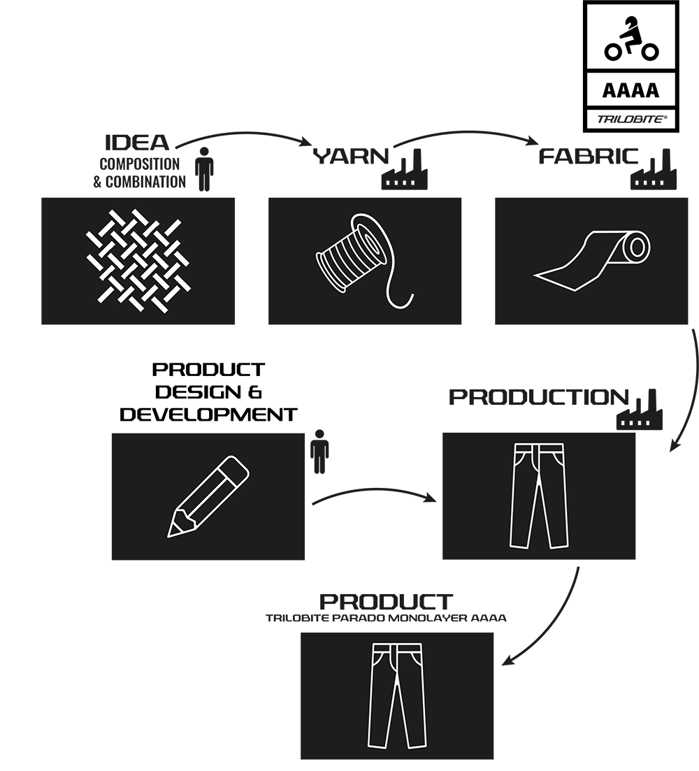 TRI-STRETCHER® PRO 5.0 DENIMis a mix of synthetic polymer fibers with Nylon and aromatic Polyamids base (Aramid) with denim look. Used for MONOLAYER production as Parado Mono Layer AAA jeans. TRI-STRETCHER® PRO 4.0 DENIMis a mix of synthetic polymer fibers with Polyethylen base (UHMPWPE). Together with aramid is used for DOUBLELAYER TON-UP 2.0 AAA jeans. TRI-STRETCHER® PRO 3.0 DENIMis a mix of four different synthetic polymer with cotton base. Will be used as MONOLAYER SOLID AA jeans or together with aramid will be used for DOUBLELAYER AAA jeans in 2025 colection. TRI-STRETCHER® PRO 2.0 DENIMis a mix of synthetic polymer fibers with Polyethylen base (UHMPWPE) with denim look. Used mainly for MONOLAYER products such as Tactical, Omnia, Corsee, Ultima 2.0, Uptown and Downtown etc. TRILOBITE® RECYCLEDis a mix of recycled Polyester with recycled cotton. Together with aramid is used for DOUBLELAYER Parado Recycled AA jeans. TRI-STRETCHER® FABRICis a mix of synthetic polymer fibers with Polyethylen base (UHMPWPE) with canvas look. Used for Omnia jeans example. |